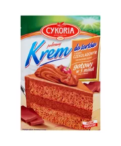 Dane produktowe Cykoria Krem do tortów o smaku czekoladowym 100 g Składniki: preparat białkowo-tłuszczowy (tłuszcze roślinne całkowicie utwardzone: palmowy, kokosowy; MLEKO w proszku odtłuszczone, emulgator: E472a, syrop glukozowy), cukier, kakao o obniżonej zawartości tłuszczu (8%),...