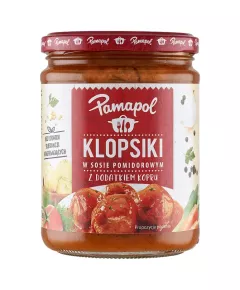 Dane produktowe Pamapol Klopsiki w sosie pomidorowym z dodatkiem kopru 500 g Składniki: woda, mięso oddzielone mechanicznie z kurczaka 11,6%, mięso wieprzowe 5,7%, warzywa w zmiennych proporcjach 4,7% (marchew, pietruszka, SELER korzeń), koncentrat pomidorowy 4,5%, cebula smażona 3,2%...