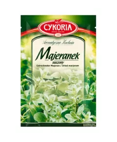 Dane produktowe Cykoria Aromatyczna Kuchnia Majeranek suszony 10 g Wysuszone ziele majeranku nadaje potrawom intensywny, aromatyczny smak. Majeranek stosuje się najczęściej do potraw z mięsa, drobiu, zup (fasolowa, grochowa, żur, ziemniaczana), flaków i potraw z grzybów. Stosuje się go...