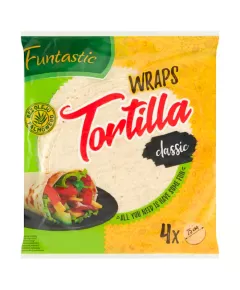 Dane produktowe Funtastic Tortilla pszenna 250 g (4 x 62,5 g) Składniki: mąka PSZENNA (69 %), woda, olej rzepakowy, stabilizator: glicerol, GLUTEN PSZENNY, regulator kwasowości: kwas jabłkowy, sól, emulgator: mono- i diglicerydy kwasów tłuszczowych, substancja spulchniająca: węglany...