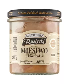 Dane produktowe Spichlerz Rusiecki Mięsiwo z kurczaka 280 g Bez mięsa oddzielanego mechanicznie Składniki: mięso z kurczaka 80 %, woda, sól, substancja żelująca: przetworzone wodorosty morskie z gatunku Eucheuma, błonnik roślinny, skrobia modyfikowana, cukier, przyprawy, warzywa suszone...