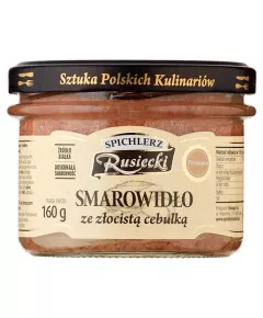 Dane produktowe Spichlerz Rusiecki Smarowidło ze złocistą cebulką 160 g Składniki: podgardle wieprzowe 26%, wątroba wieprzowa 18%, mięso oddzielone mechanicznie z kurczaka 16%, woda, tłuszcz wieprzowy 8%, skórki wieprzowe 7%, mięso wieprzowe 6%, skrobia modyfikowana, mąka PSZENNA, sól,...