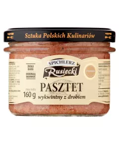 Dane produktowe Spichlerz Rusiecki Pasztet wykwintny z drobiem 160 g Składniki: wątroba z kurczaka 21%, mięso wieprzowe 21%, woda, skórki z kurczaka 14%, tłuszcz wieprzowy, mięso z kurczaka 7,5%, skrobia modyfikowana, sól, przyprawy, stabilizator: cytrynian sodu, fosforany potasu,...