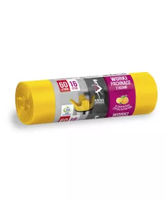 Worki na śmieci z uszami - zapach CYTRUSÓW 60L 1op.-16szt. Ekologiczne, żółte worki na śmieci z uszami o zapachu cytrynowym służą do pakowania wszelkich odpadów gospodarczych i śmieci. Worki na śmieci posiadają tzw. gwieździsty zgrzew dna, dzięki czemu dno worka jest...