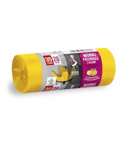 Worki na śmieci z uszami - zapach CYTRUSÓW 35L 1op.-28szt. Ekologiczne, żółte worki na śmieci z uszami o zapachu cytrynowym służą do pakowania wszelkich odpadów gospodarczych i śmieci. Worki na śmieci posiadają tzw. gwieździsty zgrzew dna, dzięki czemu dno worka jest...