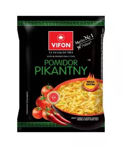 Dane produktowe Vifon Zupa błyskawiczna z chili pomidor pikantny 70 g Składniki: kluski (86,4%): mąka PSZENNA, tłuszcz palmowy, tapioka, sól, skrobia modyfikowana, cukier, stabilizatory: trifosforany, guma guar; substancje spulchniające: węglany potasu, węglany sodu; kurkuma, dodatki...
