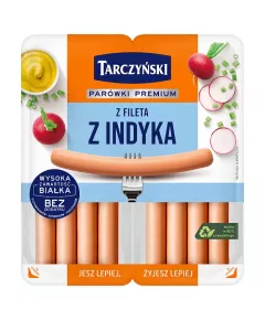 Dane produktowe Tarczyński Parówki premium z fileta z indyka 160 g (2 x 80 g) Polska Rodzinna Firma Składniki: filet z piersi indyka 90 %, tłuszcz z indyka, sól, skrobia, przyprawy, ekstrakty przypraw, aromaty (w tym aromat dymu wędzarniczego), cukier, przeciwutleniacz: askorbinian...
