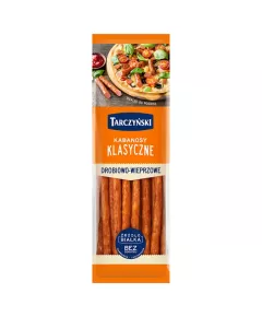 Dane produktowe Tarczyński Kabanosy klasyczne drobiowe z dodatkiem wieprzowiny Składniki: mięso drobiowe (mięso z kurczaka, mięso z indyka), mięso wieprzowe, tłuszcz wieprzowy, skrobia, sól, przyprawy, ekstrakty przypraw, aromaty (w tym aromat dymu wędzarniczego), białko wieprzowe,...