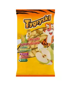 Dane produktowe Tygryski Chrupki kukurydziane o smaku jabłkowym 77 g Składniki: 65 % kasza kukurydziana, 35 % krem o smaku jabłkowym: olej rzepakowy, olej kokosowy w zmiennych proporcjach, cukier puder, 1,3 % zagęszczony sok jabłkowy, odtłuszczone MLEKO w proszku, serwatka w proszku (z...
