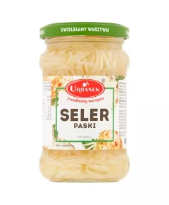 Dane produktowe Urbanek Seler paski 300 g Składniki: SELER, woda, cukier, ocet spirytusowy, sól, regulator kwasowości - kwas cytrynowy Dodatki Marka Urbanek Dodatkowe informacje Przechowywanie Po otwarciu przechowywać w warunkach chłodniczych nie dłużej niż 48...