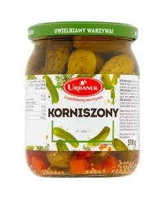 Dane produktowe Urbanek Korniszony 510 g Składniki: ogórki, woda, ocet spirytusowy, cukier, sól, koper, marchew, cebula, GORCZYCA, mieszanka przypraw Dodatki Marka Urbanek Dodatkowe informacje Przechowywanie Po otwarciu przechowywać w warunkach chłodniczych nie...