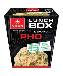 Dane produktowe Vifon Lunch Box Pho Danie błyskawiczne 85 g Składniki: kluski ryżowe (82,4%): ryż (90%), skrobia modyfikowana, cukier, sól, wzmacniacz smaku: glutaminian monosodowy; stabilizator: guma guar, dodatki smakowe (8,5%): sól, wzmacniacze smaku: glutaminian monosodowy,...