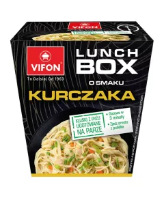 Dane produktowe Vifon Lunch Box Danie błyskawiczne o smaku kurczaka 85 g Składniki: kluski ryżowe (82,6%): ryż (90%), skrobia modyfikowana, cukier, sól, wzmacniacz smaku: glutaminian monosodowy; stabilizator: guma guar, dodatki smakowe (10,6%): sól, zabielacz (tłuszcz palmowy, syrop...