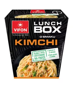 Dane produktowe Vifon Lunch Box Danie błyskawiczne o smaku kimchi 85 g Składniki: kluski ryżowe (79,3%): ryż (90%), skrobia modyfikowana, cukier, sól, wzmacniacz smaku: glutaminian monosodowy; stabilizator: guma guar, dodatki smakowe (12,4%): cukier, sól, wzmacniacze smaku: glutaminian...