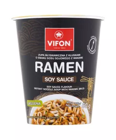 Dane produktowe Vifon Ramen Zupa błyskawiczna 60 g Składniki: kluski (92%): mąka PSZENNA, tłuszcz palmowy, tapioka, skrobia modyfikowana, sól, cukier, stabilizatory: trifosforany, guma guar; substancje spulchniające: węglany potasu, węglany sodu; kurkuma, dodatki smakowe (8%): sól...