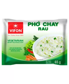 Dane produktowe Vifon Wietnamska zupa Pho Chay Rau wegetariańska 65 g Składniki: kluski ryżowe (78,6 %): ryż (90 %), skrobia modyfikowana, cukier, sól, wzmacniacz smaku: glutaminian monosodowy; stabilizator: guma guar, dodatki smakowe (12,6 %): sól, wzmacniacze smaku: glutaminian...