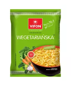 Dane produktowe Vifon Zupa błyskawiczna wegetariańska 70 g Składniki: kluski (92,1%): mąka PSZENNA, tłuszcz palmowy, tapioka, sól, skrobia modyfikowana, cukier, stabilizatory: trifosforany, guma guar; substancje spulchniające: węglany potasu, węglany sodu; kurkuma, dodatki smakowe...