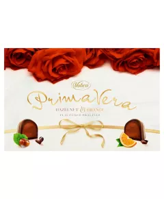 Dane produktowe Vobro PrimaVera Praliny z nadzieniem o smaku pomarańczowym i orzechowym 140 g Składniki: cukier, miazga kakaowa, tłuszcz palmowy, tłuszcz kakaowy, serwatka w proszku (z MLEKA), tłuszcz MLECZNY, MLEKO w proszku odtłuszczone, kakao o obniżonej zawartości tłuszczu, miazga...